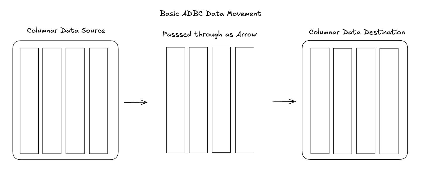 ADBC addresses this issue by letting you exchange data as Apache Arrow RecordBatch streams. Instead of loading an entire result set into memory at once, you can incrementally fetch and write batches in sequence. This makes it practical to move datasets that are larger than memory.