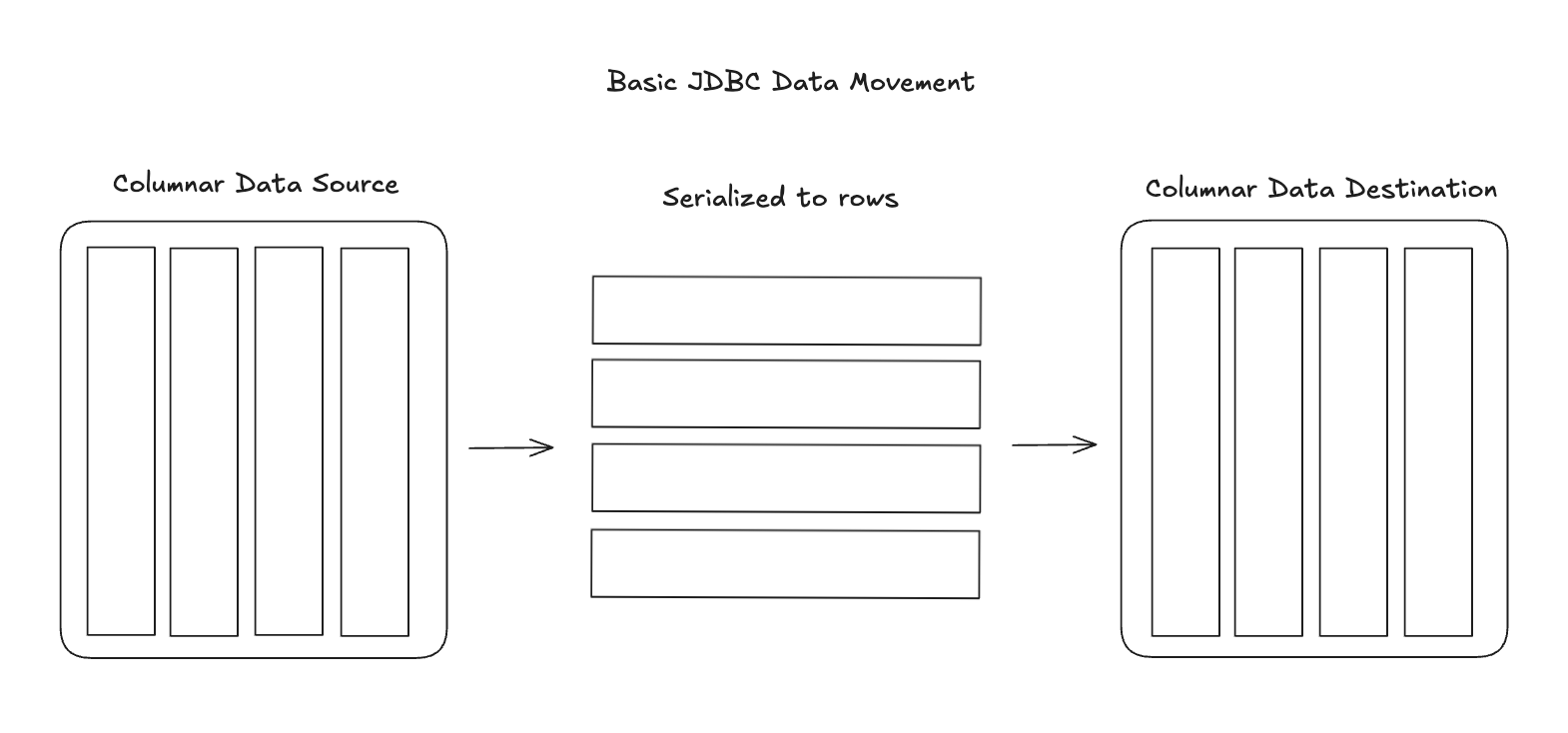 The problem with this is that many modern data systems are using column-oriented data warehouses like BigQuery and Snowflake or in-memory databases like DuckDB. These are primarily meant for analytical workloads. When you try to use JDBC to move data between columnar systems you’re getting a very inefficient process. It actually seems absurd when you think through it. At a very high level, ELI5 mental model it would look like this: