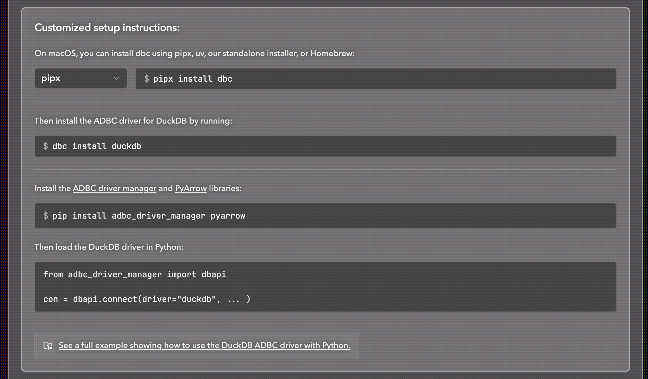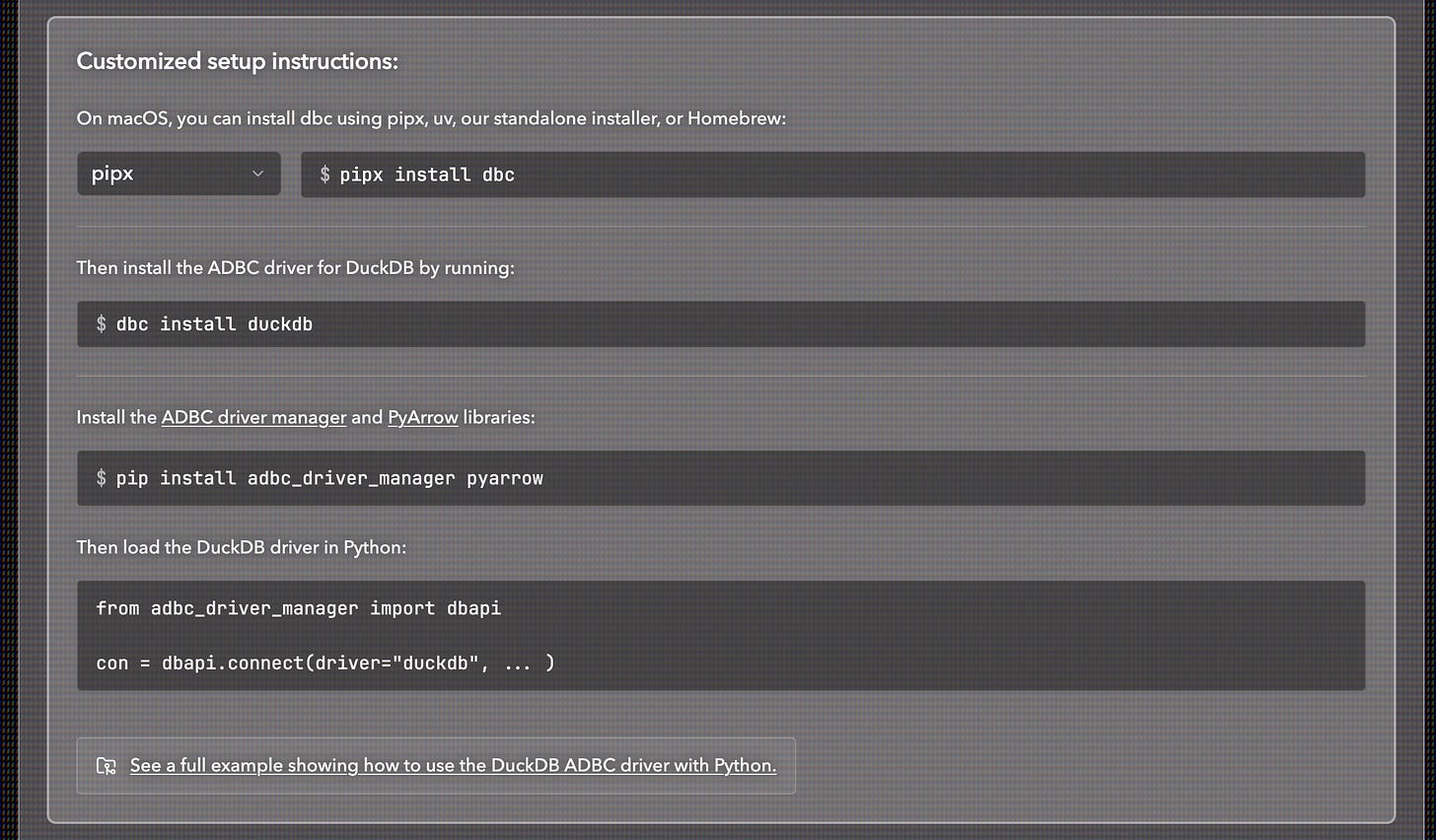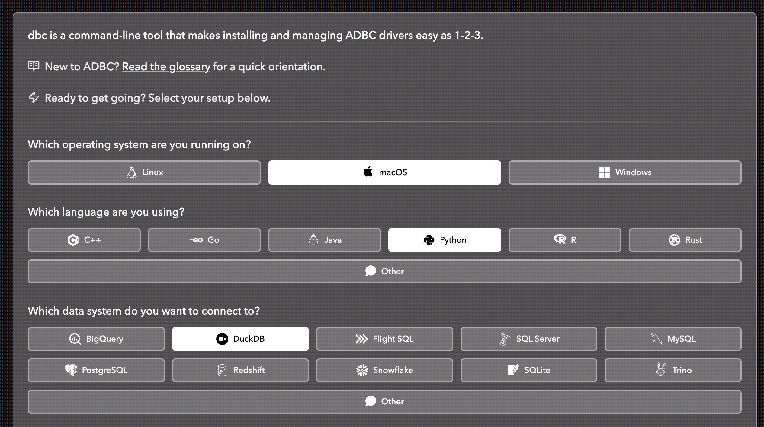 When you use ADBC you need to download the driver related to your OS and system you want to connect to. You can build drivers yourself, or hunt for pre-built drivers from various sources, but I prefer using dbc, a CLI tool made specifically for ADBC driver installs. The page for the tool lets you choose all your prerequisites and then gives you the command you need to install the driver. It just makes it that much more convenient vs scrolling through the ADBC docs to figure out what the driver name and command is. For example, if I need to download the DuckDB driver for macOS and use it with Python: