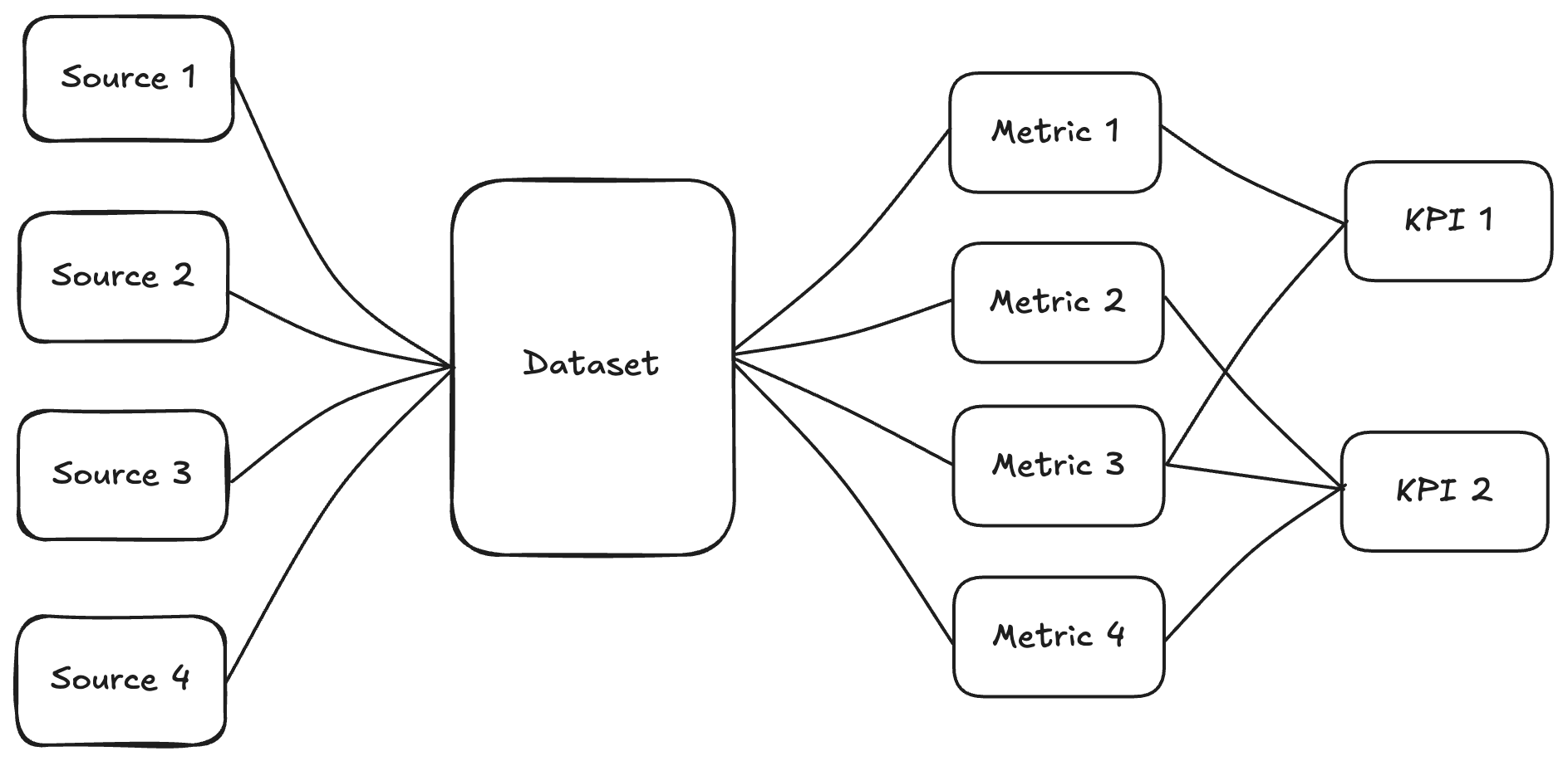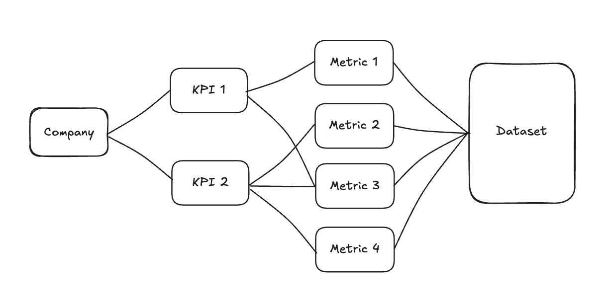 So when you think about things this way, the image above actually reverses. The hypothetical business becomes the “source” to where you then decide on success (KPIs) the metrics that measure that success and ultimately what a dataset would need to look like to build those metrics.