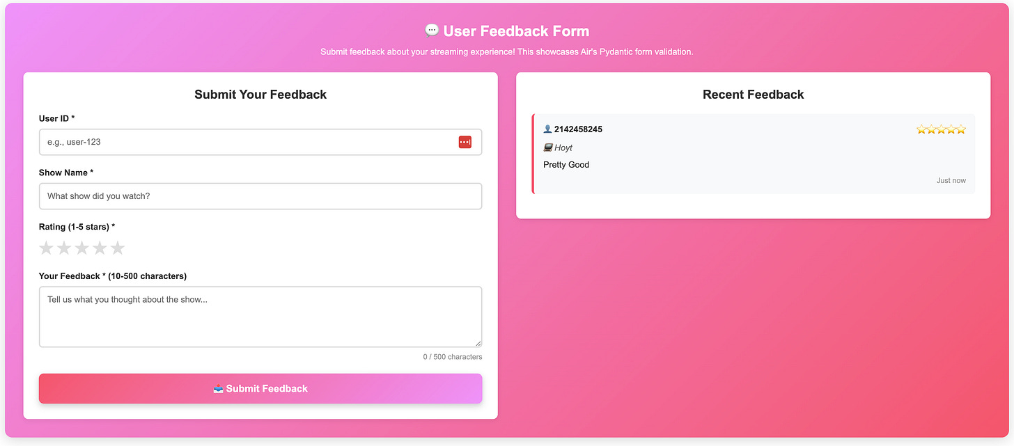 To explore Air’s form handling capabilities, I had the LLM create a feedback form that uses Pydantic models for validation. This provides a powerful way to ensure data integrity and type safety while maintaining a clean user experience. The new section showcases how Air seamlessly bridges backend validation with frontend form handling.