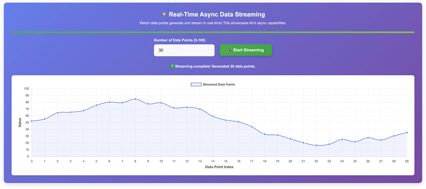 To showcase Air’s async capabilities, I collaborated with the new Claude 4.5 to develop a useful demo. My initial concept was to create a text input where users could enter a number, submit it, and watch a graph update in real time. Claude suggested the app generate that many sequential numbers and update the graph as each new number appeared. The result was an animated visualization that updated dynamically without refreshing the page. Meanwhile, all other page elements remained fully functional and responsive. Seeing this realtime interaction without page reloads was the “magic moment” that really got me excited about what Air offers.
