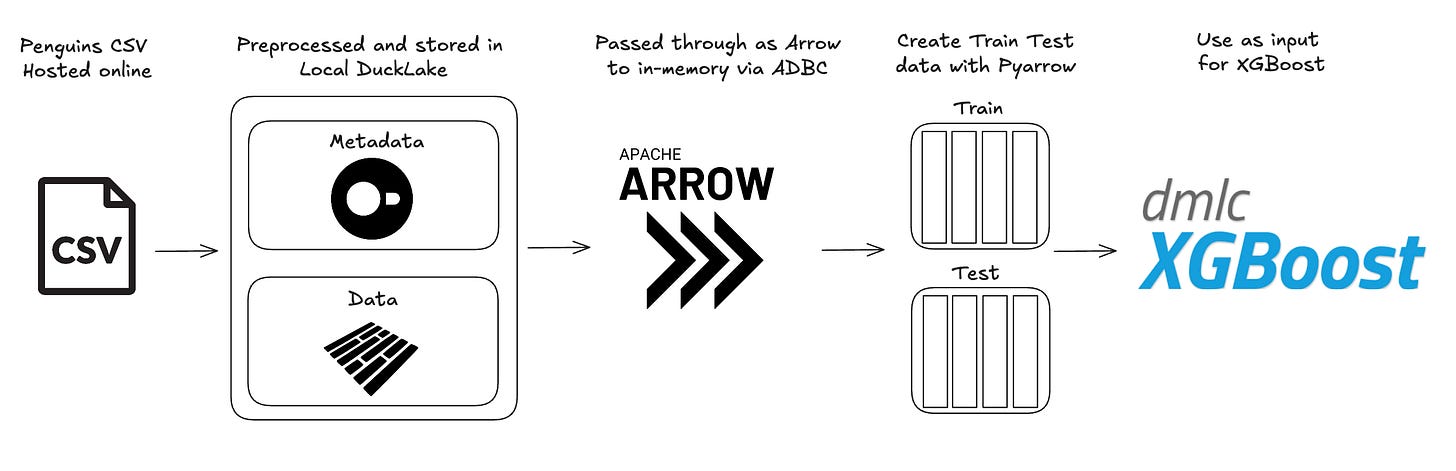 ADBC (Arrow Database Connectivity) enables efficient data transfer from one columnar data source to another with minimal copying. This means you are moving memory pointers from one place to another until you need to actually materialize the data for use. In our use case today, we're working with a local DuckLake instance (which could also be a production or managed DuckLake) that we create an ADBC connection with. ADBC allows us to read the DuckLake data as an Arrow table and store in-memory. We can then use the PyArrow library to split the Arrow table into two shuffled Arrow tables that are used as a data input for XGBoost to train and test on. We end up using the Apache Arrow ecosystem to handle what would need at least two other library dependencies. Let’s get into it!