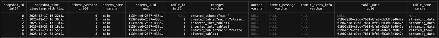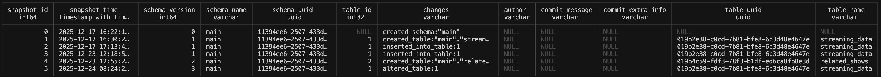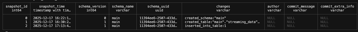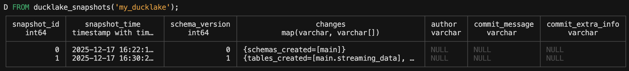 FROM 'path_to_data';Now, DuckLake has a built in function that let’s you also view snapshot history and you’ll notice it is a little different.