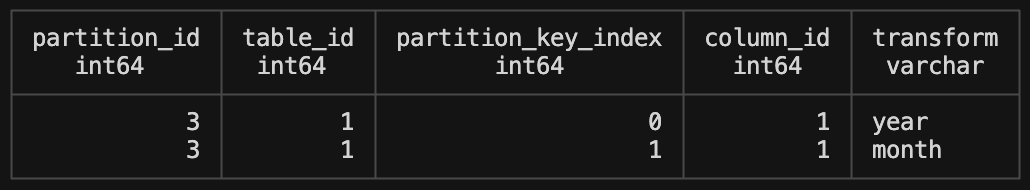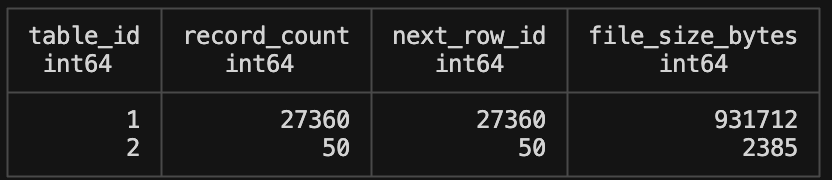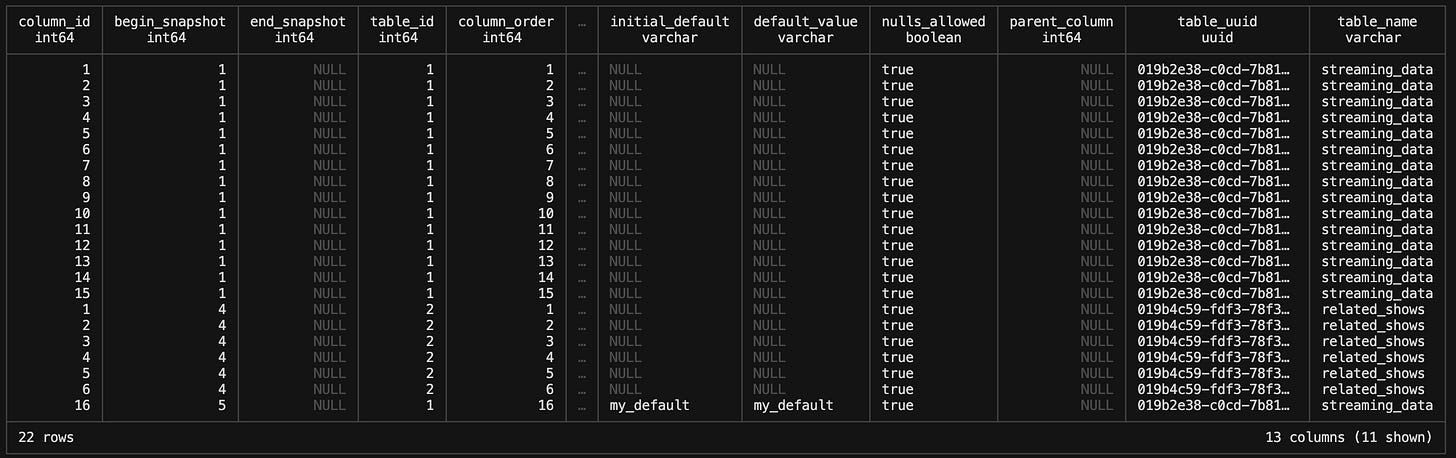 You’ll notice that it has two different table_id values, which represent each of our tables we’ve created, as well as two different begin_snapshot values for each table. They are also ordered by table_id and then column id in ascending order.
