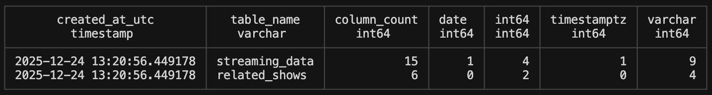ON cc.table_name = ctc.table_name;What is nice about DuckDB is that we can use the PIVOT command to spread out a column. This isn’t always available across other OLTP or OLAP databases. But we can see here that we get some nice high level statistics that we can look at over time. We can run this query and append it to the same table to see if things change over time. In fact, why don’t we add a new column to see how that looks.