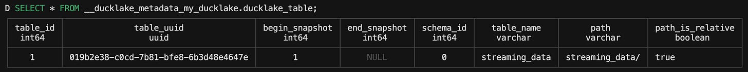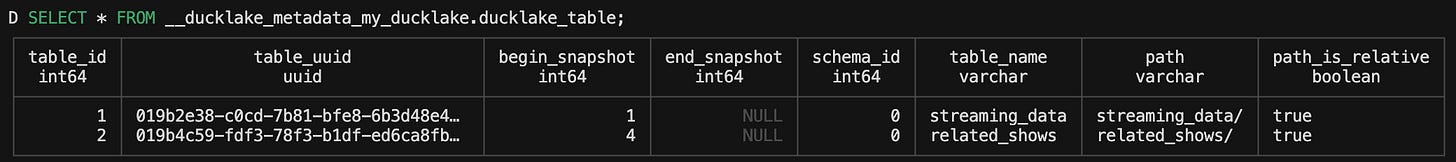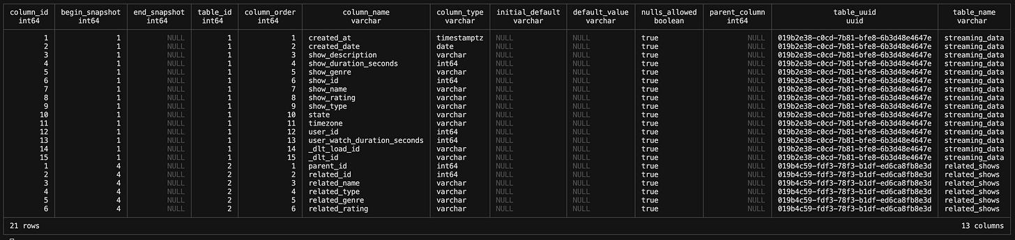 This gives us visibility into schema evolution, which is an amazing feature of the DuckLake metadata tables. It allows us to see exactly what happened and when. This is most noted when we look at the joined query we have made above: