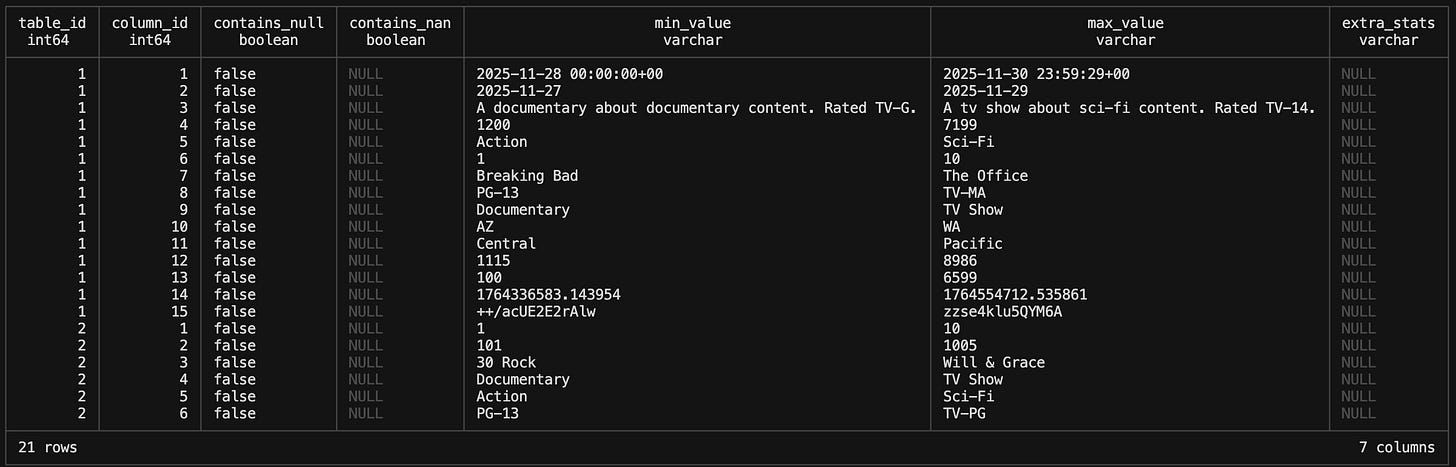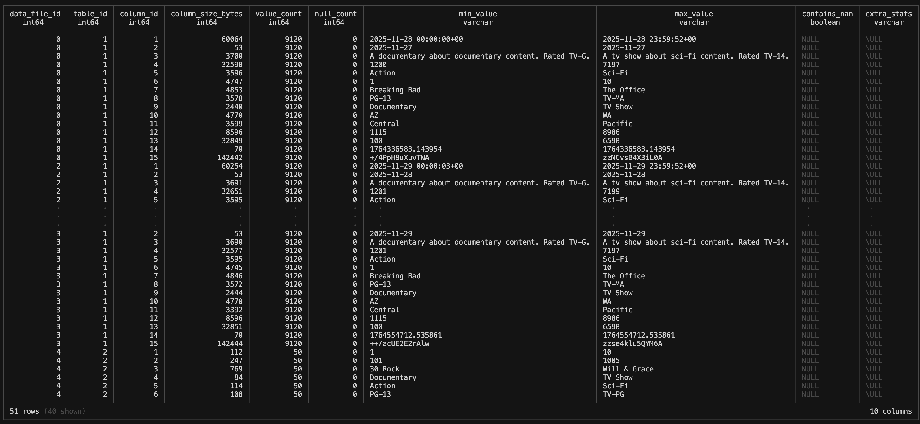 This is a very interesting table because it has min and max values for each column. Which is slightly more granular information than the ducklake_table table we were looking at above.