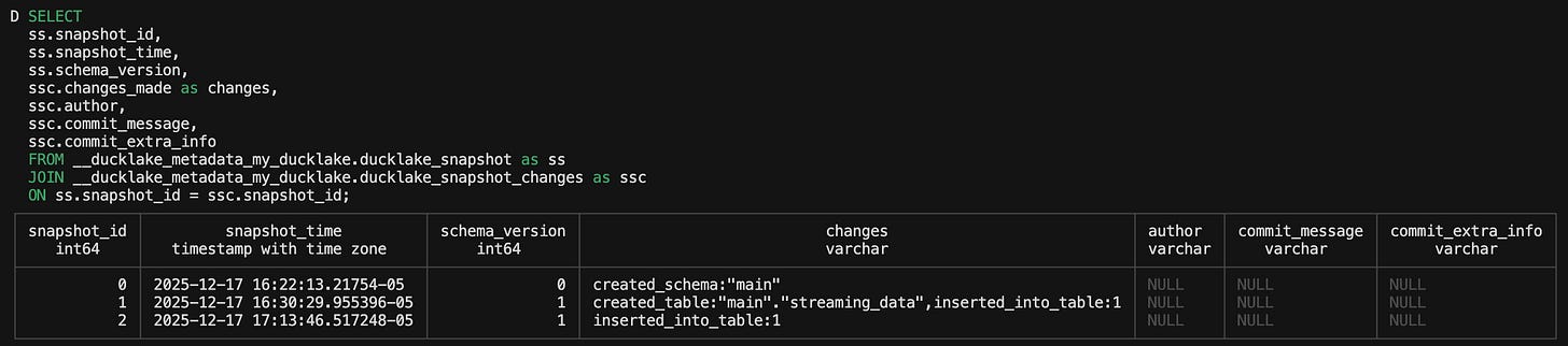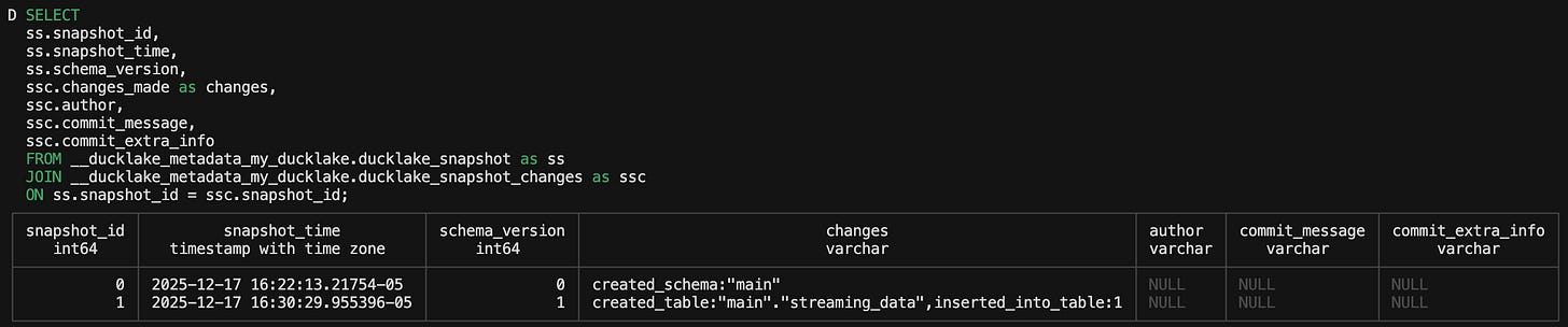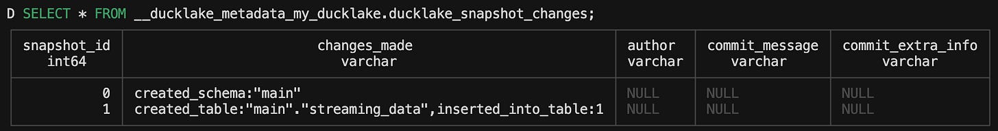 FROM ducklake_snapshots('my_ducklake');There’s a changes column as well as author, commit_message and commit_extra_info. These all live in another metadata table called ‘ducklake_snapshot_changes’.