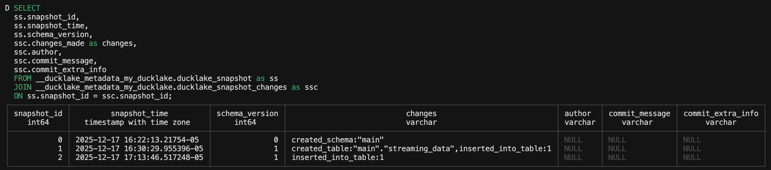 's3://path-to-file.parquet')The above query will append data to the current streaming_data table in the my_ducklake database. For a quick reference, the snapshot query we made now shows this: