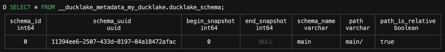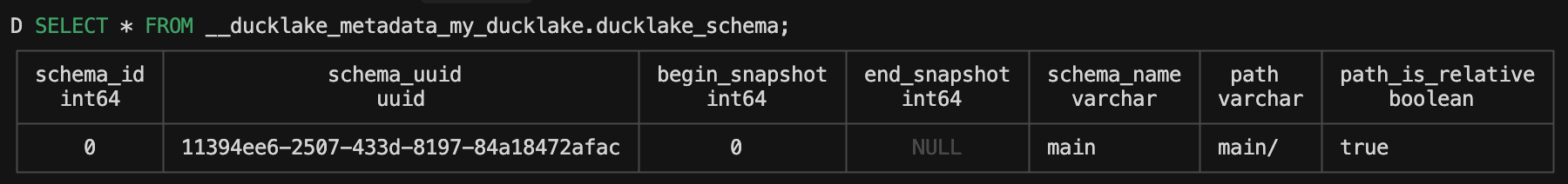 SELECT * FROM __ducklake_metadata_my_ducklake.ducklake_schema;You might get a little confused here. There are multiple schema_version id’s in the ducklake_snapshot table but only one row in the schema table itself. That’s because this is the table that has the id for the ACTUAL schema that was created (“main”). The main schema is created once and all subsequent updates to the table in the schema is captured in the snapshot table. However, the main schema is distinct and has just one id. Also, the begin_snapshot column can be joined to the schema_version column of the ducklake_snapshot table. In the snapshot table, the schema version of “0” is referencing the actual creation of the schema itself. The next versions in the schema table are “1” because a table has then been created in the schema. Once you add a table to a schema you get a new schema version in the snapshot table.