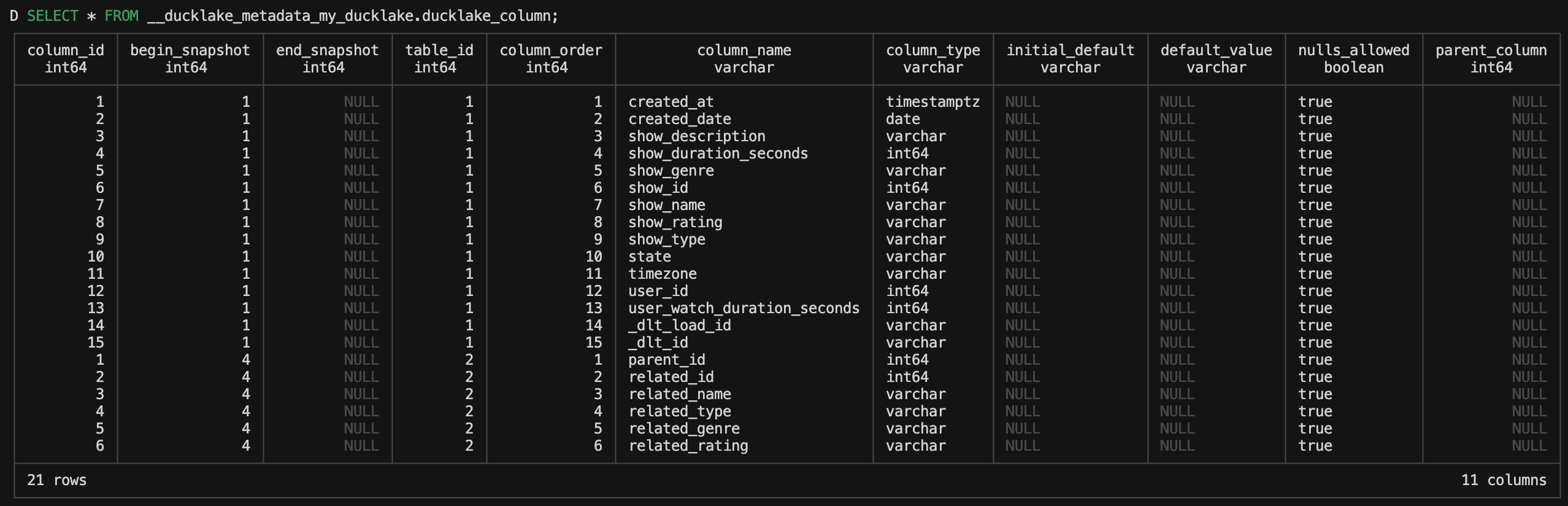 DuckLake has a full schema explanation of all columns for all available tables as well as the ability to track schema evolution over time. The initial ducklake_column table for our tables looks like this: