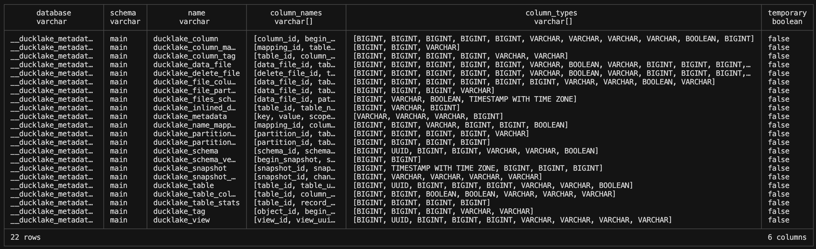 USE my_ducklake;There are 22 Metadata tables that are created when you create a DuckLake. You can quickly see all the metadata tables created by using the “show all tables” command in the terminal.