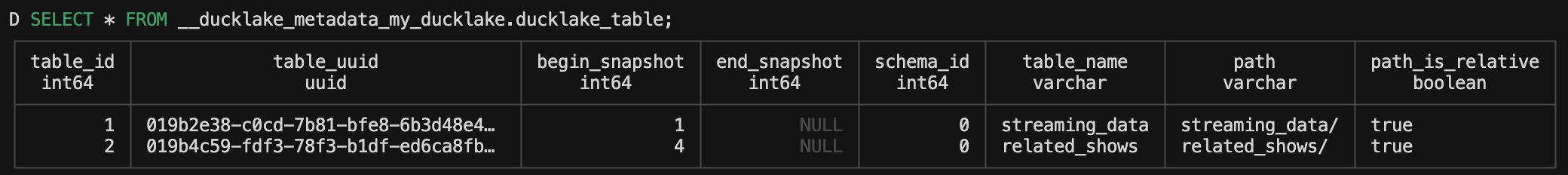FROM 'path_to_data';If we look at the ducklake_table table again we will see a new UUID for the new table, but also you will note that the begin_snapshot column is ‘4’. This allows us to join where these tables were created in the ducklake_snapshot table.