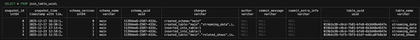 SELECT * FROM join_schema_uuid;So what happens if we add a new table to this schema? It’s certainly something we are allowed to do. A DuckLake can encompass multiple tables. Let’s bring in some different data for a new table and find out! I have another dataset I use that can be joined to the streaming_data synthetic dataset called related_shows: