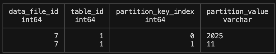 This is the last group of tables we will look at. You can partition a DuckLake and these tables will show you useful information about the partitions.