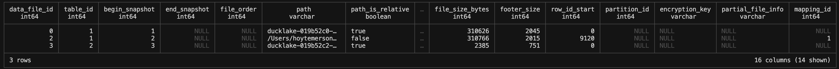 SELECT * FROM __ducklake_metadata_my_ducklake.ducklake_data_file; The data_file_id column is the numeric identifier of the file. It is a primary key. data_file_id is incremented from next_file_id in the ducklake_snapshot table. So we can join those tables using begin_snapshot = snapshot_id. This will show us the size of the data file added at that snapshot and what row it started it.